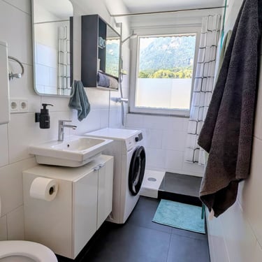 Badezimmer mit Dusche, WC und Waschmaschine