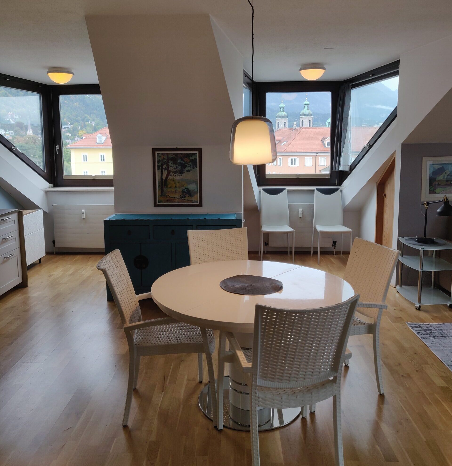 The apartment is 72m², has one large bedroom and is fully-furnished. It is located on the 5th (and top) floor of a well-maintained building in the centre of Innsbruck. A lift runs to the 4th floor. The apartment faces northeast and southeast and has stunning views overlooking the city and mountains.